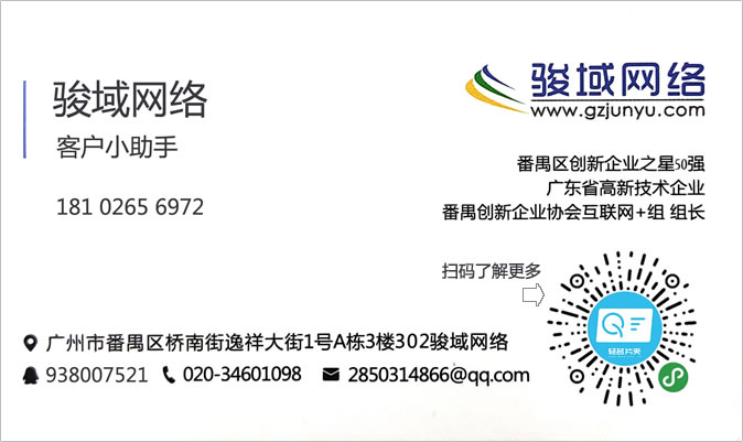 廣州駿域網(wǎng)絡(luò)科技有限公司成立于2005年,是一支由眾多具有多年實踐經(jīng)驗的專業(yè)人士組成的高新技術(shù)團隊,專為企業(yè)提供網(wǎng)站建設(shè)、全網(wǎng)營銷、郵箱等服務(wù),我們擁有嚴謹?shù)某绦蜷_發(fā)人員、專業(yè)的美工設(shè)計、隨時為您效勞的售后服務(wù)人員,團隊人數(shù)達一百多人。目前我們已經(jīng)榮幸的為廣州眾多知名企業(yè)提供了包括網(wǎng)站建設(shè)、手機網(wǎng)站、小程序、企業(yè)軟件開發(fā)等多種基于互聯(lián)網(wǎng)技術(shù)的服務(wù)。 通過長期積累,駿域網(wǎng)絡(luò)目前已經(jīng)擁有50000多家客戶。